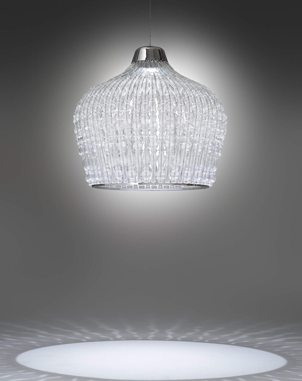 Glaselementens lätthet möter metallens elegans och skapar en dekorativ ljuskomposition som både imponerar och förfinar rummet.