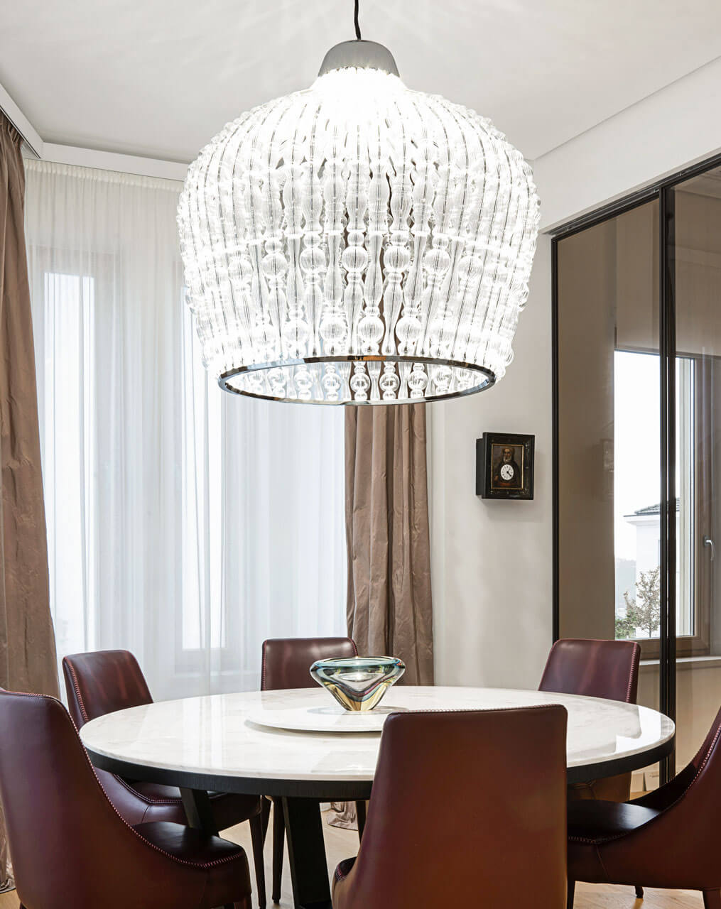 Lampan förenar funktion och estetik, och bildar ett centralt blickfång som förhöjer atmosfären i varje interiör.