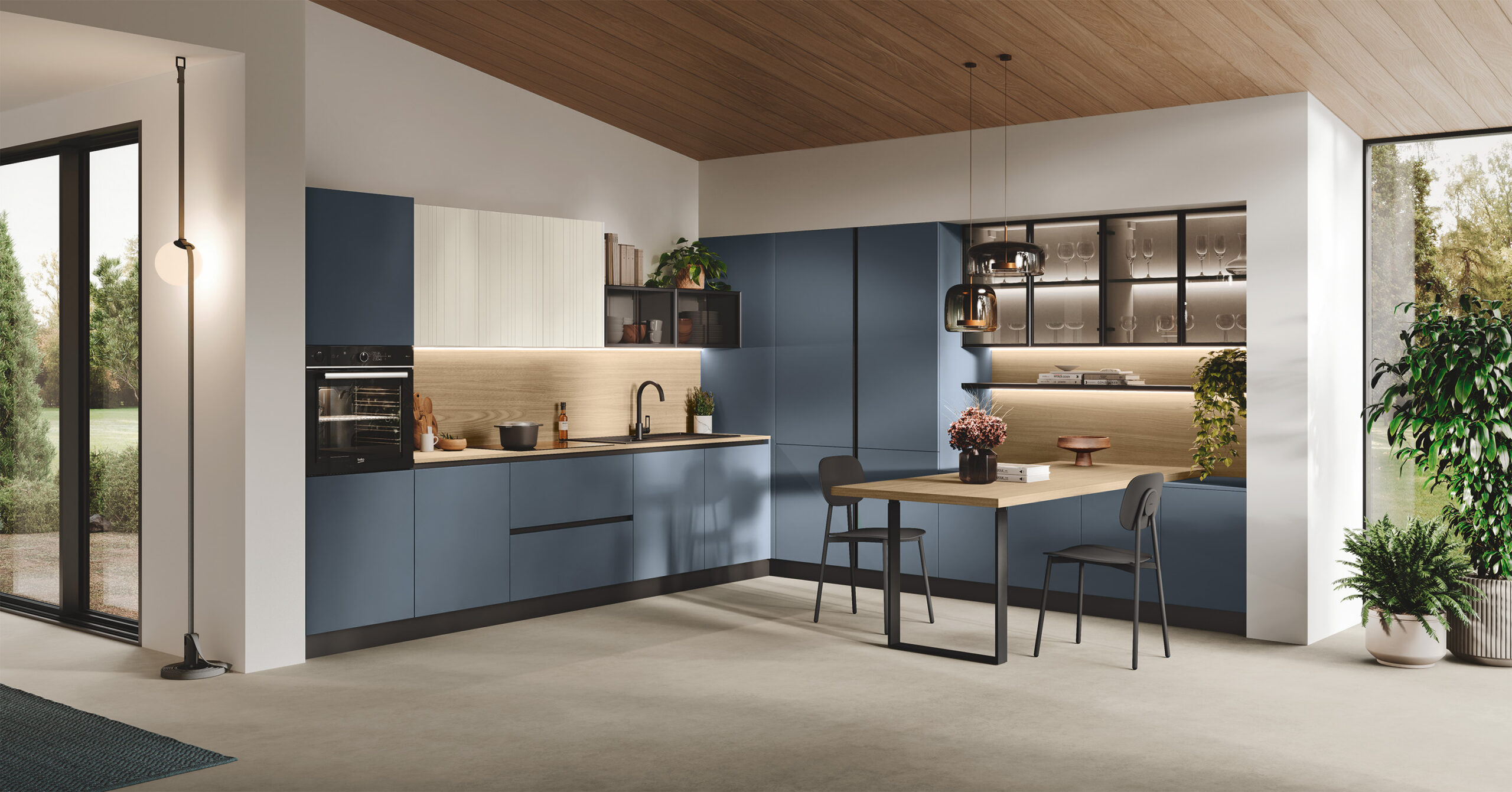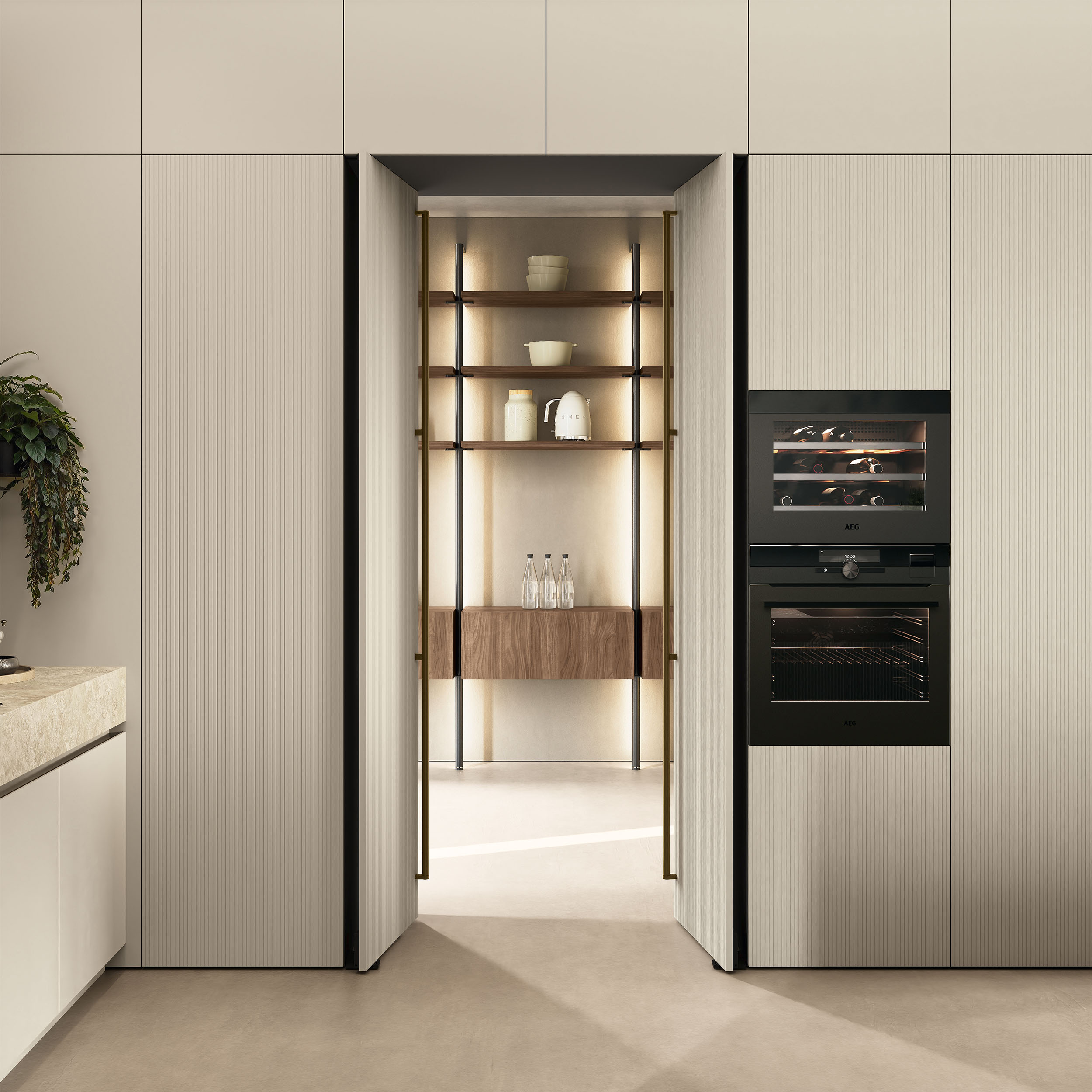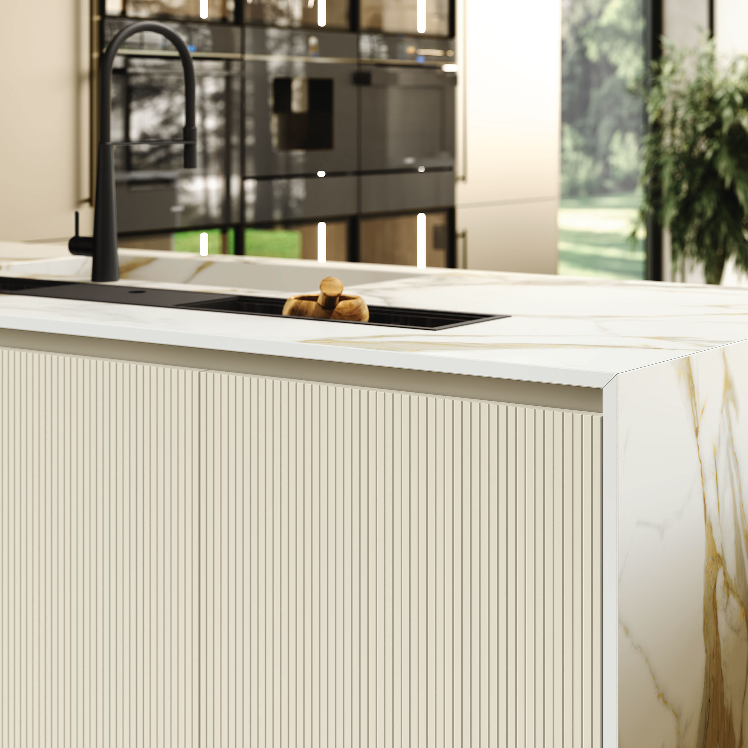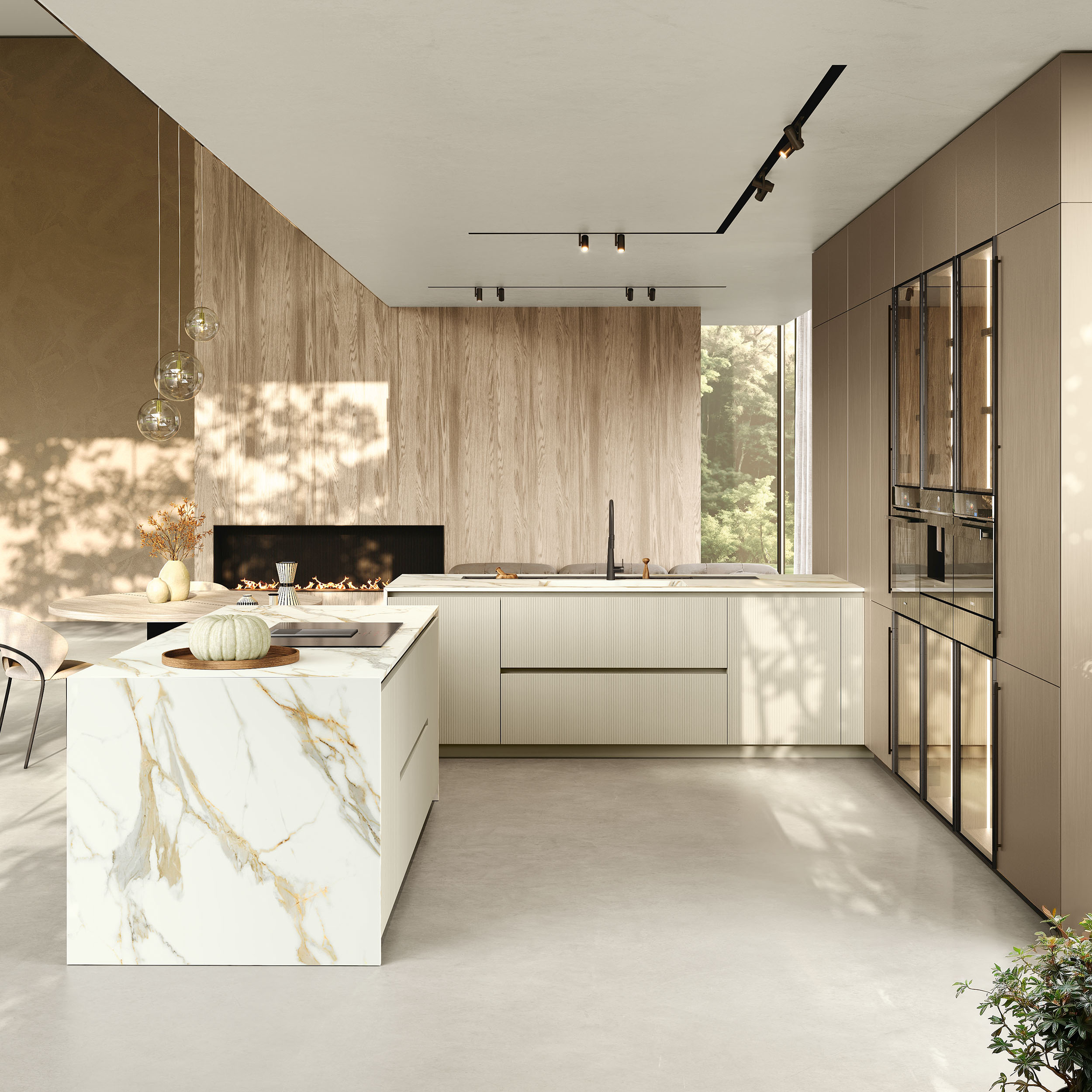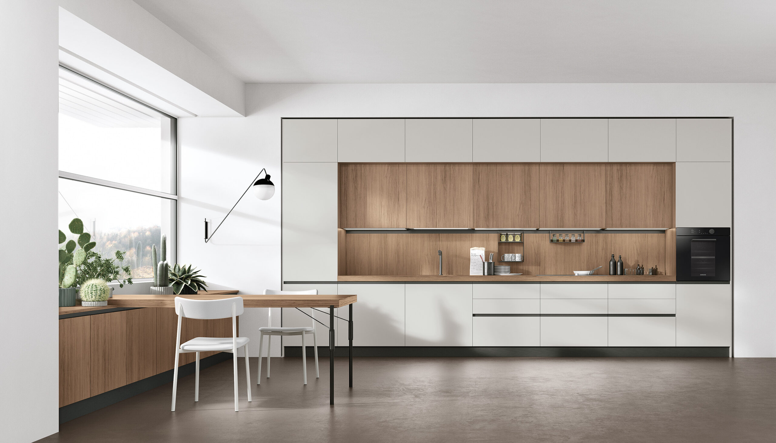Släta luckor skapar en känsla av skandinavisk enkelhet och lätthet. Den rena designen framhäver kökets moderna och avskalade karaktär och skapar en funktionell och stilren atmosfär.