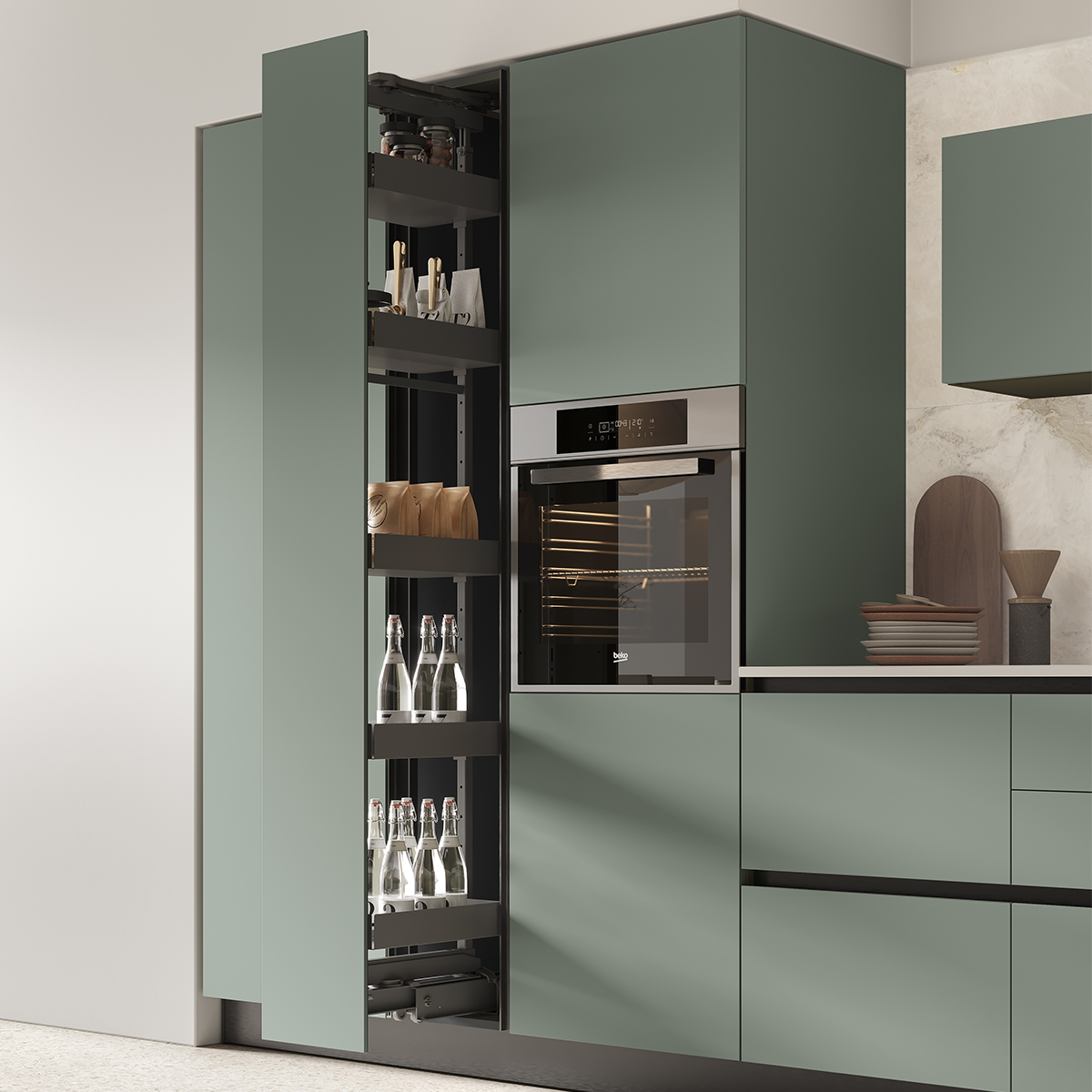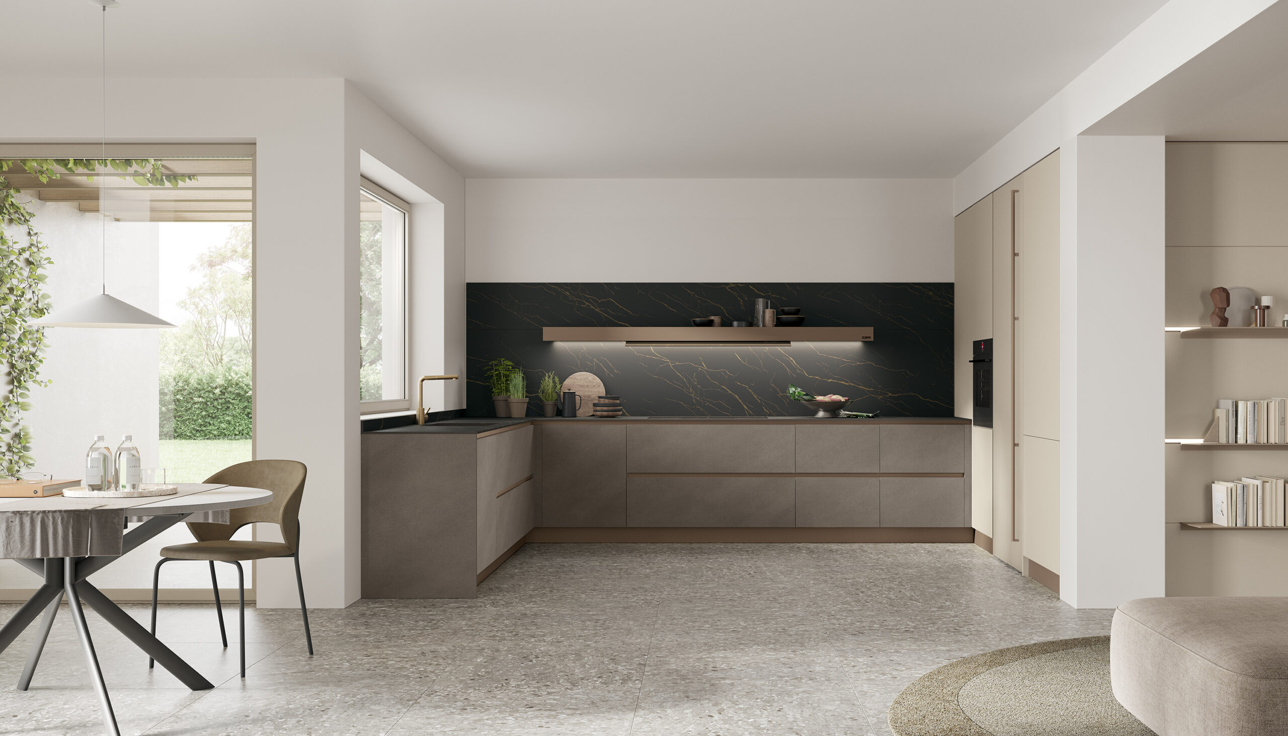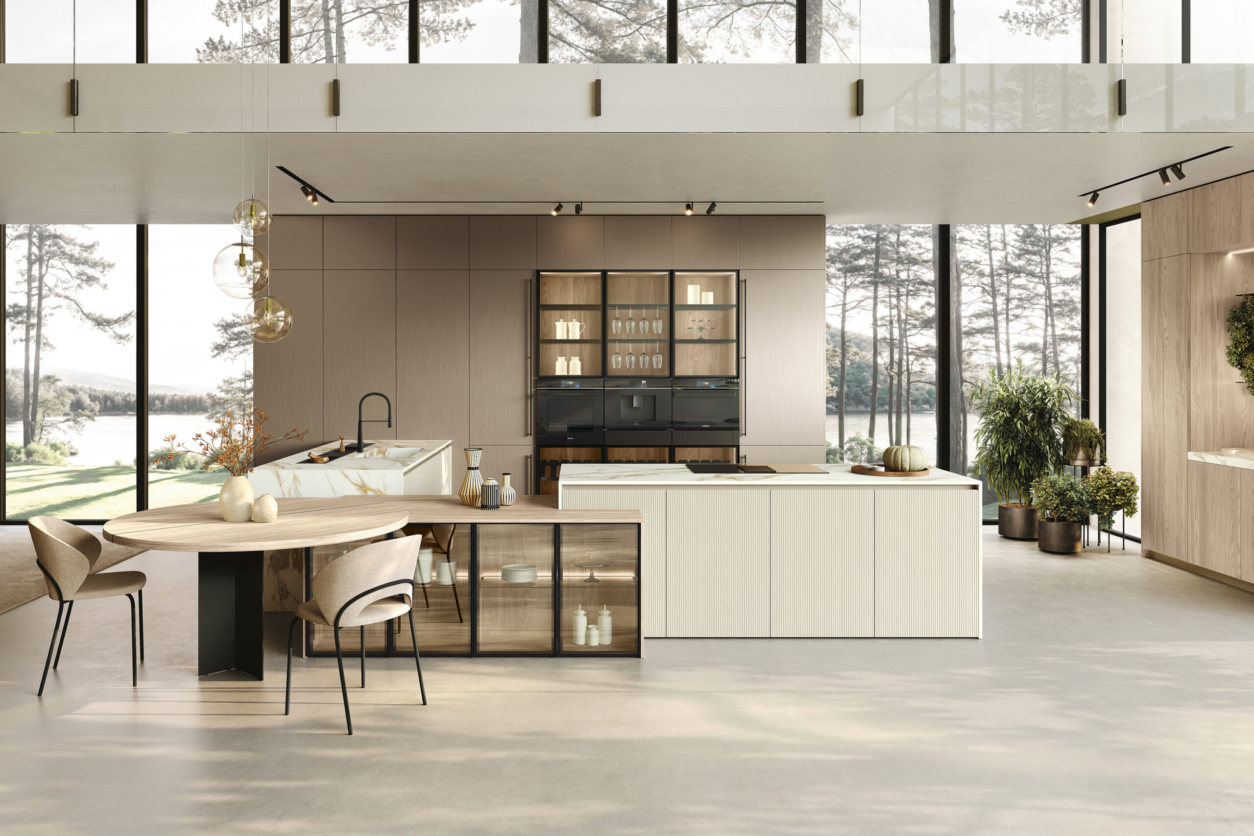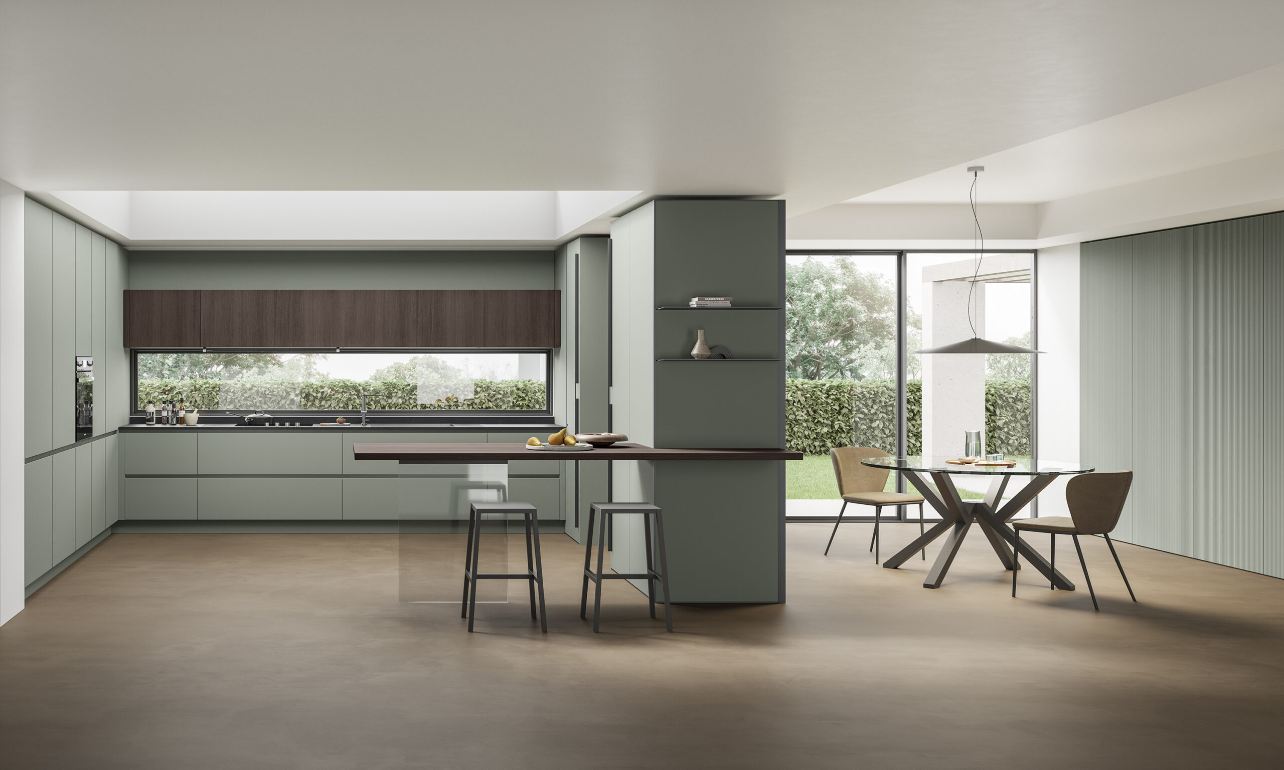 Släta luckor skapar en känsla av skandinavisk enkelhet och lätthet. Den rena designen framhäver kökets moderna och avskalade karaktär och skapar en funktionell och stilren atmosfär.