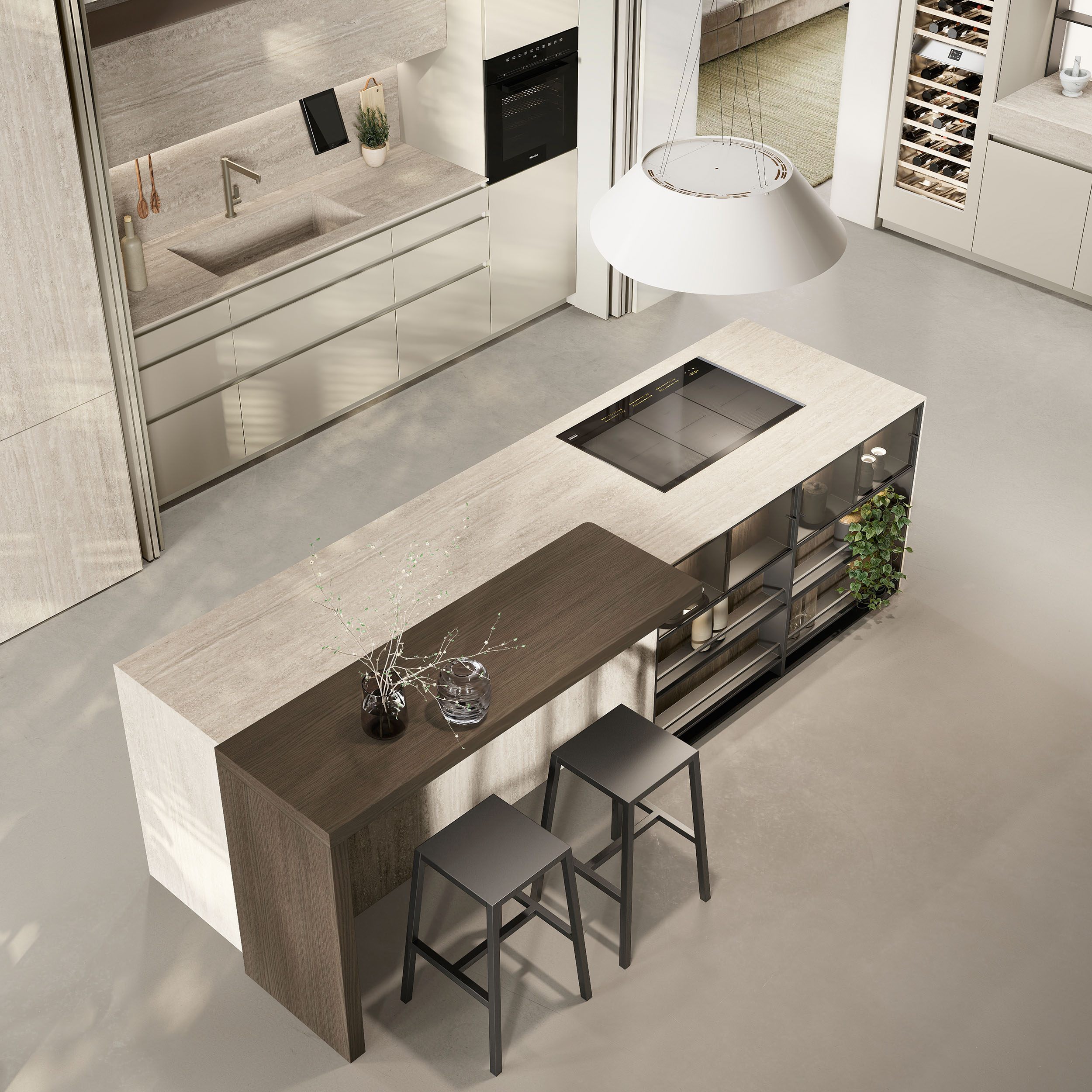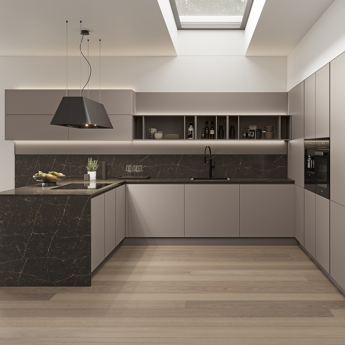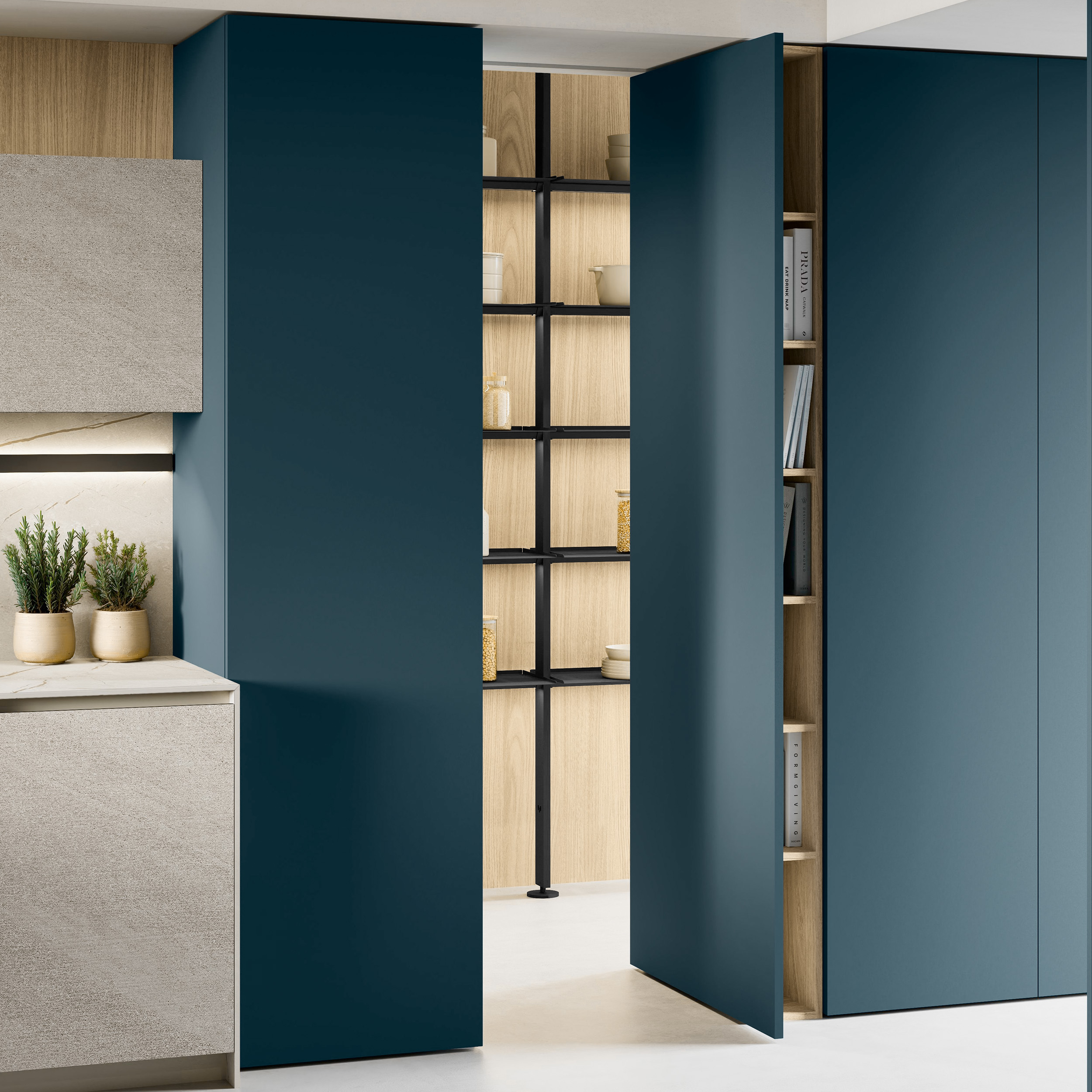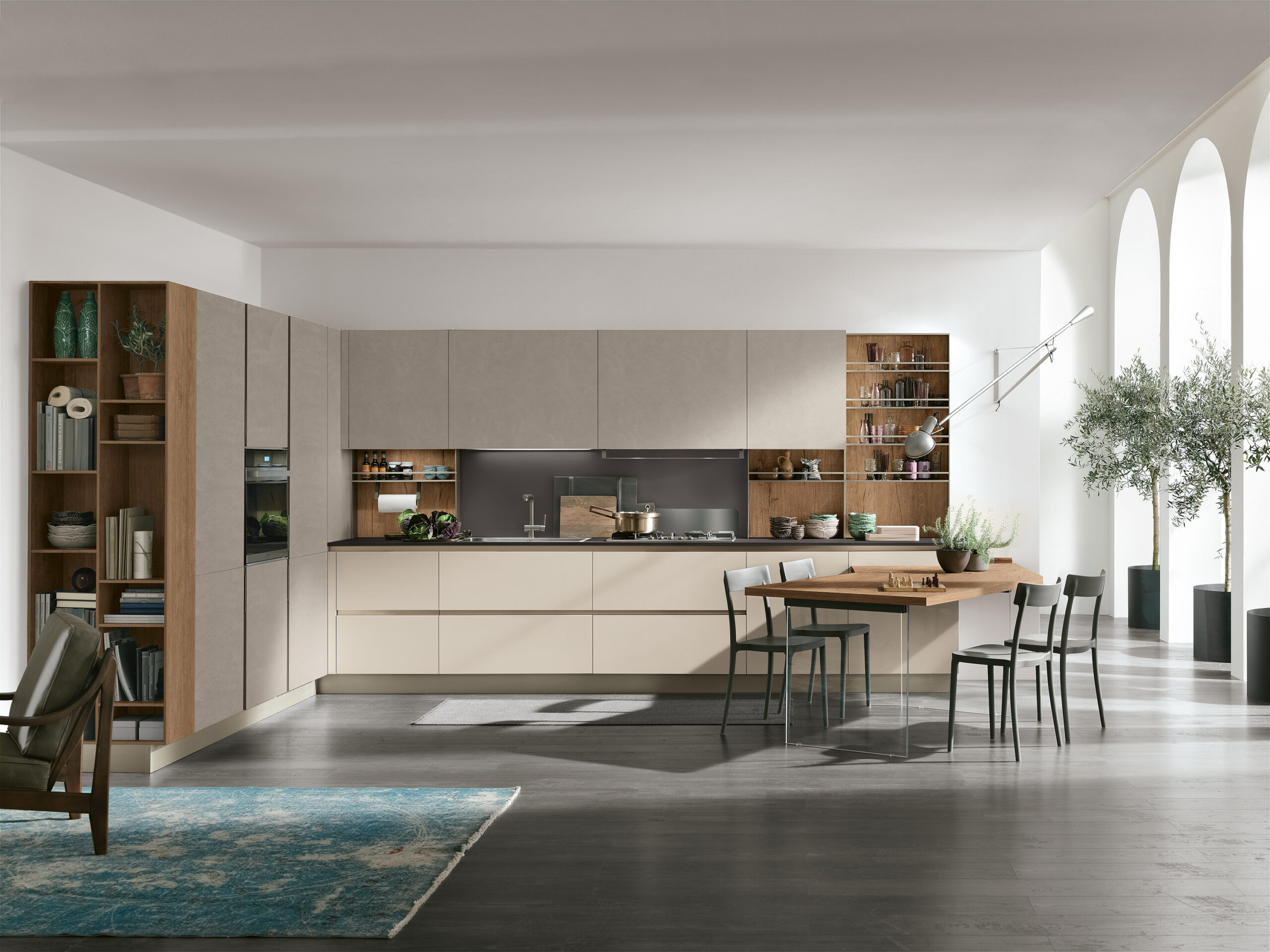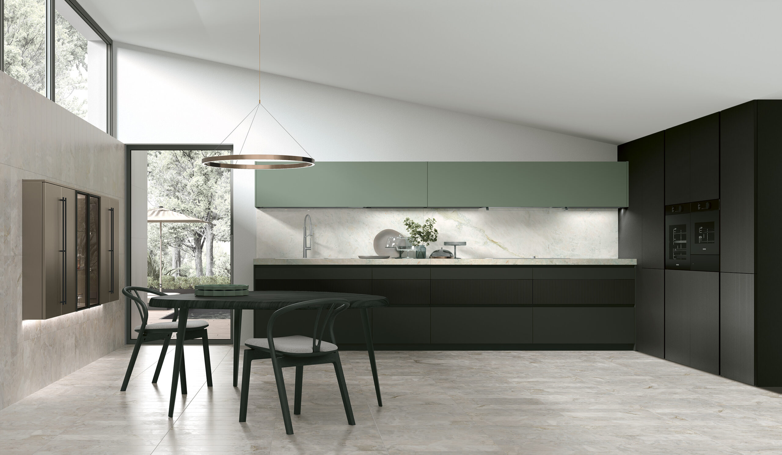 Släta luckor skapar en känsla av skandinavisk enkelhet och lätthet. Den rena designen framhäver kökets moderna och avskalade karaktär och skapar en funktionell och stilren atmosfär.