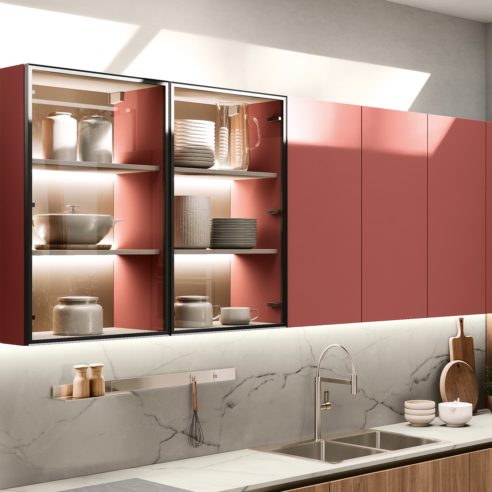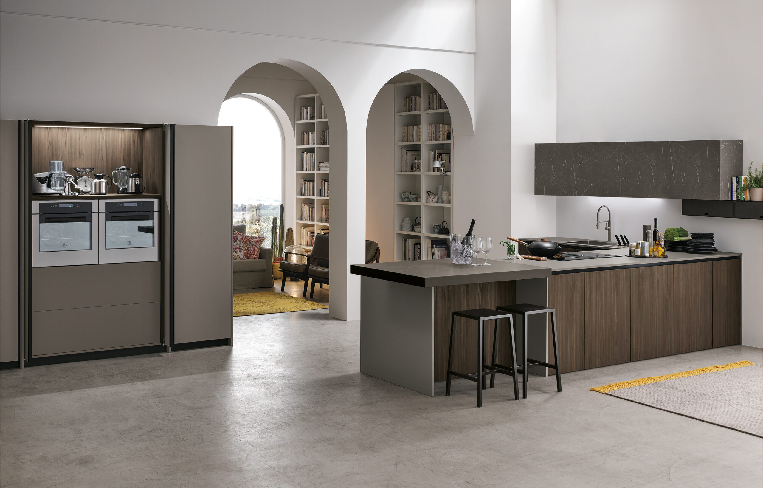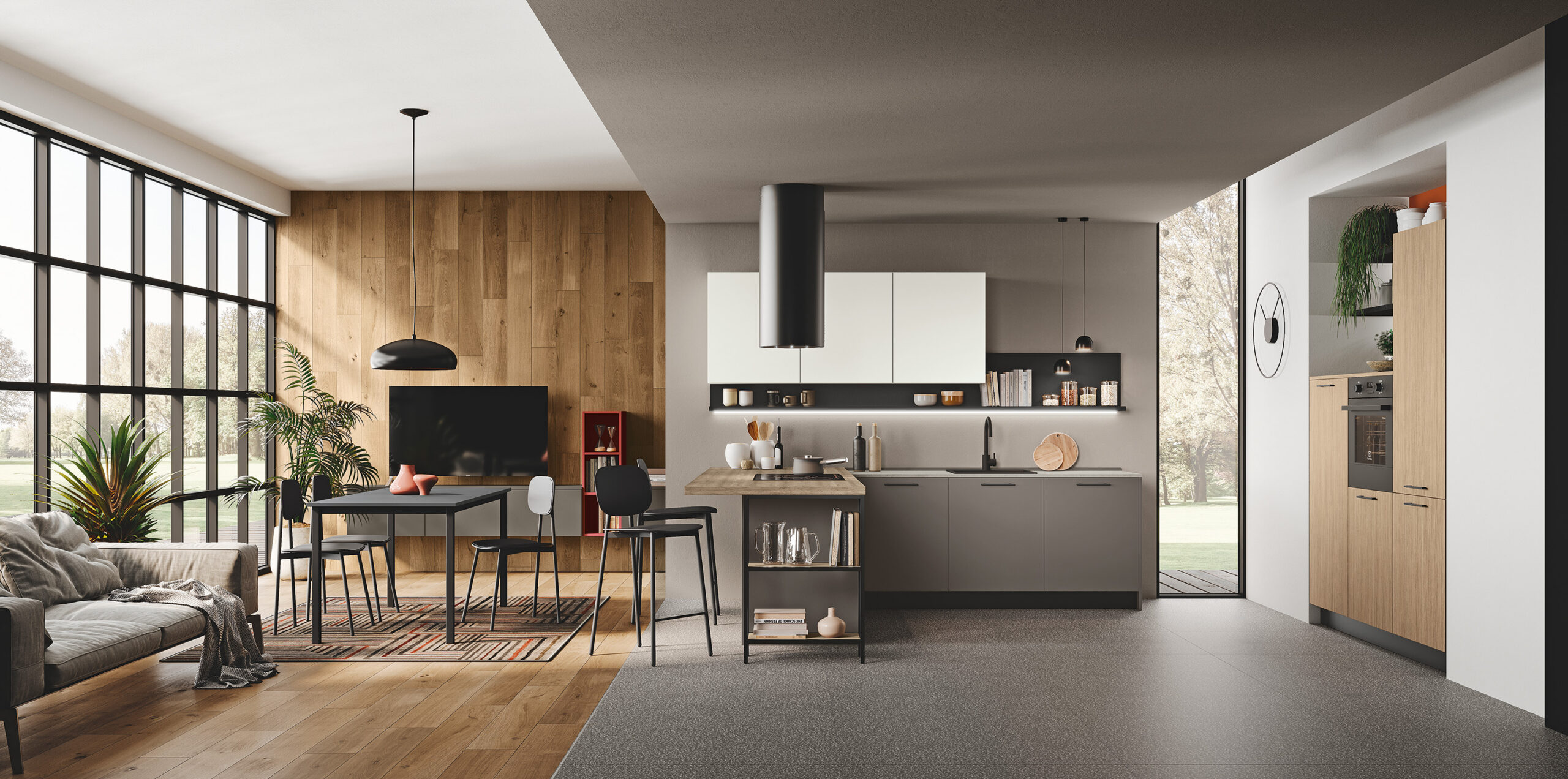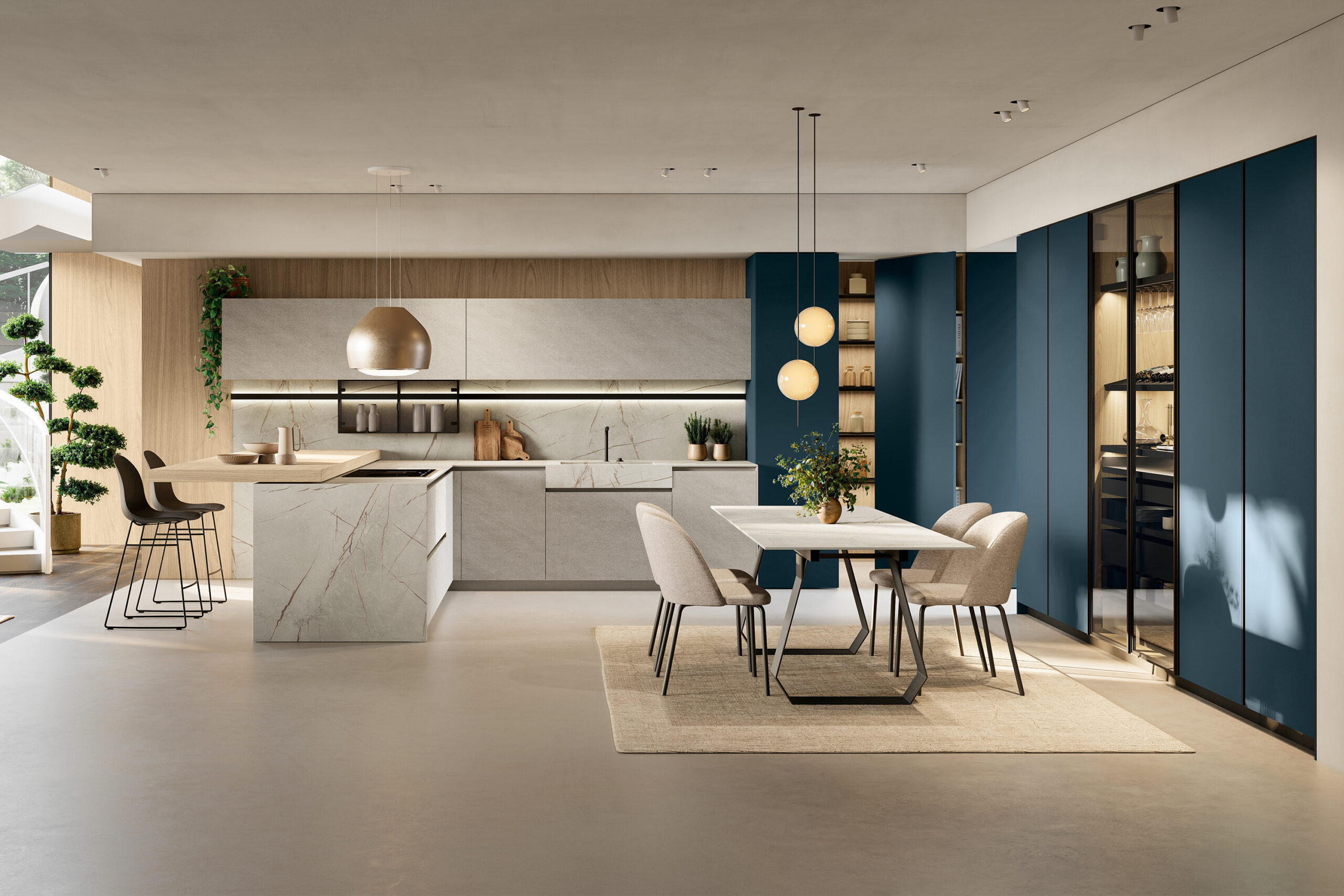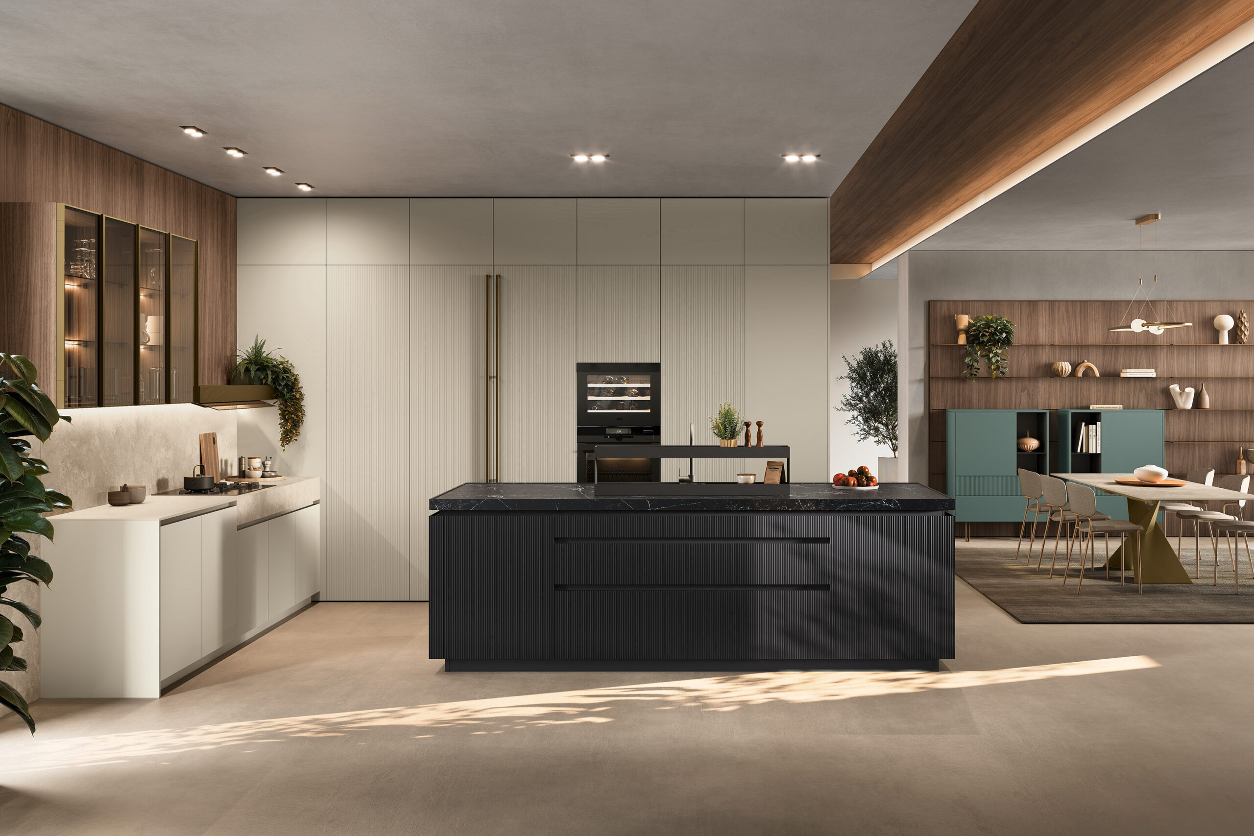 Släta luckor skapar en känsla av skandinavisk enkelhet och lätthet. Den rena designen framhäver kökets moderna och avskalade karaktär och skapar en funktionell och stilren atmosfär.