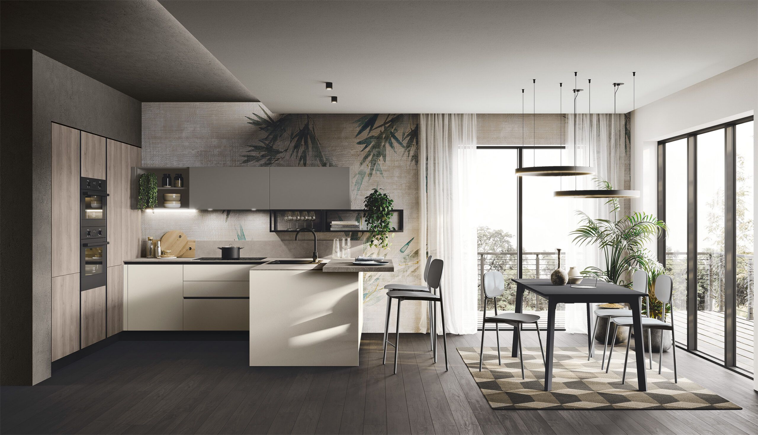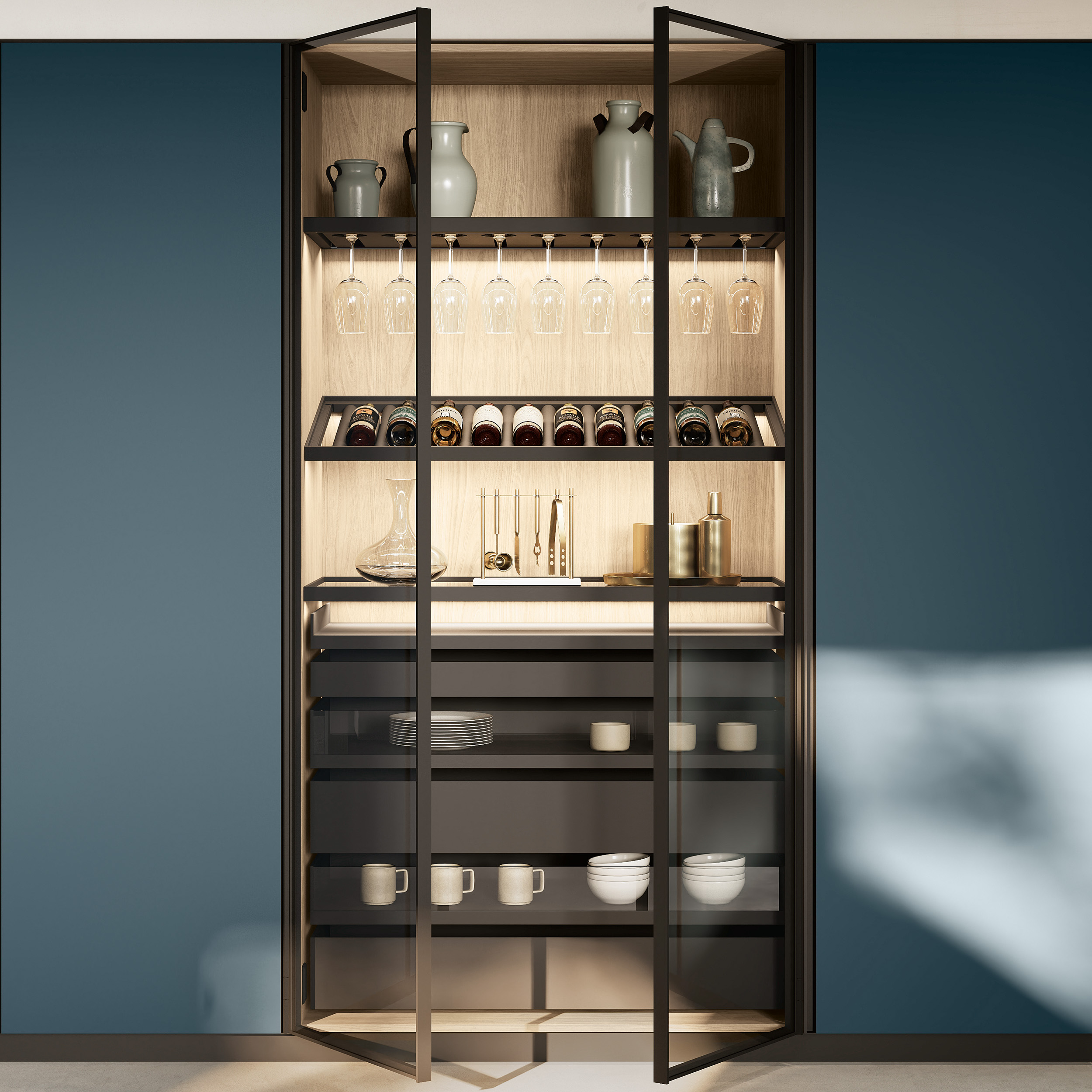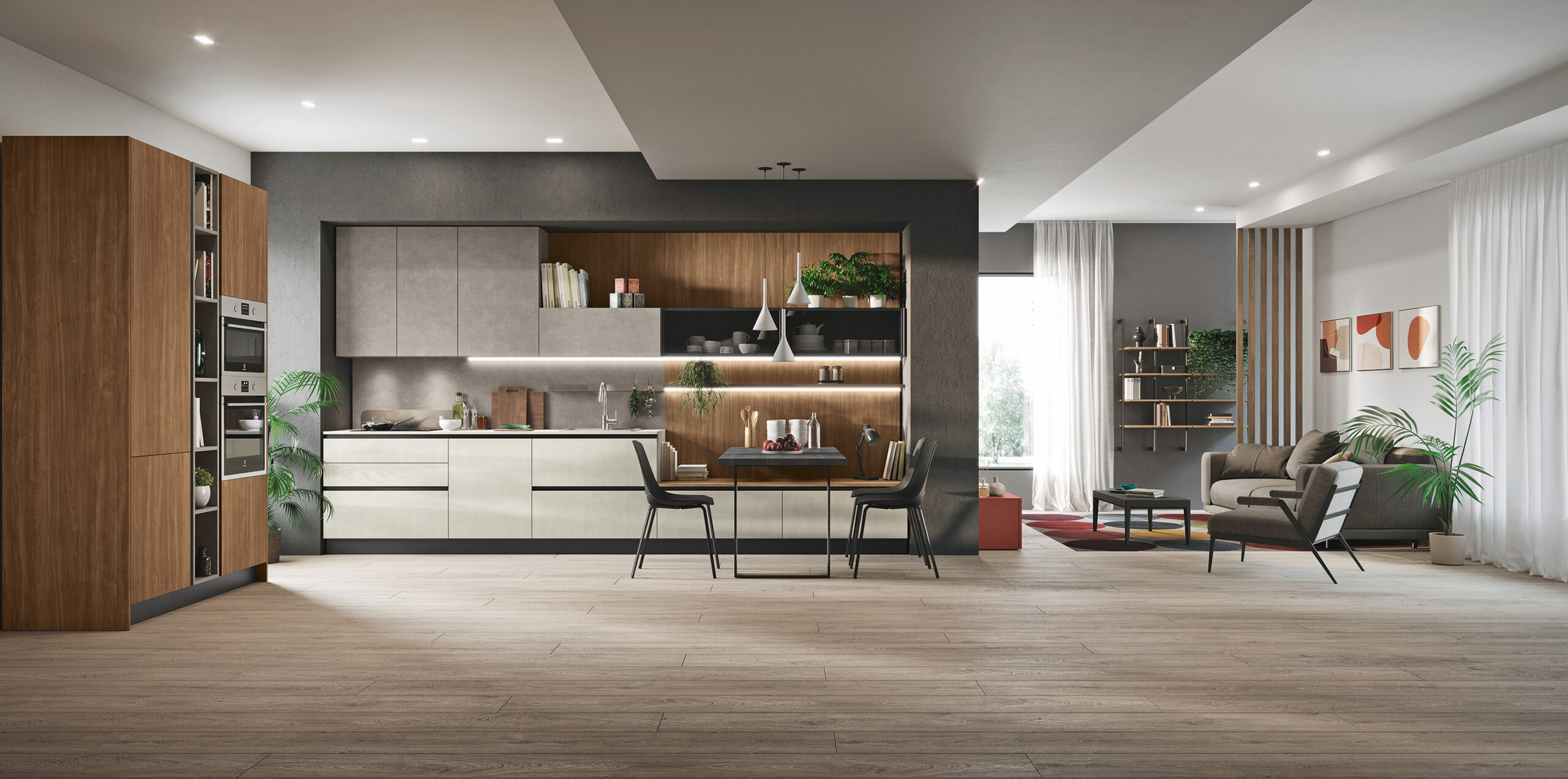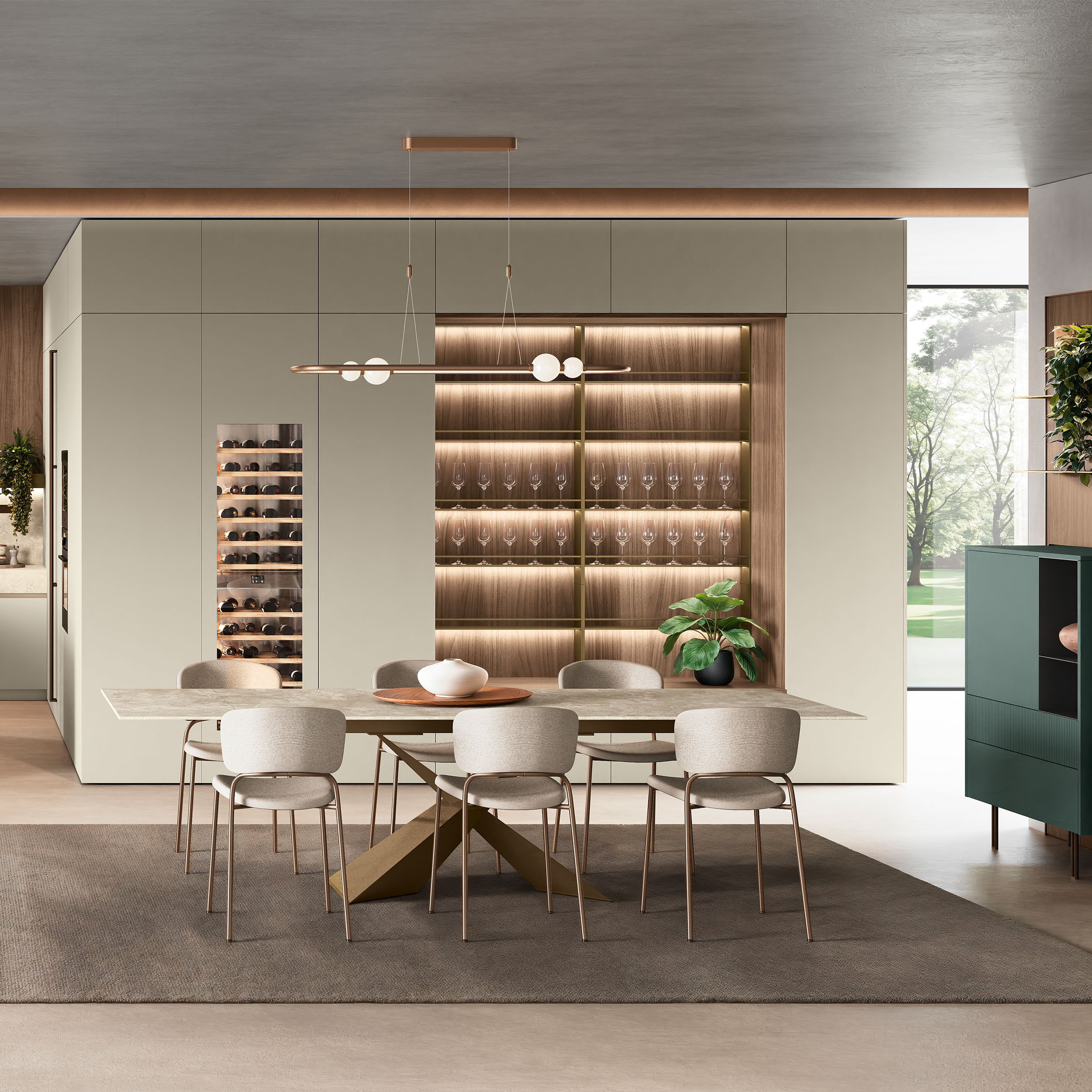 Släta luckor skapar en känsla av skandinavisk enkelhet och lätthet. Den rena designen framhäver kökets moderna och avskalade karaktär och skapar en funktionell och stilren atmosfär.