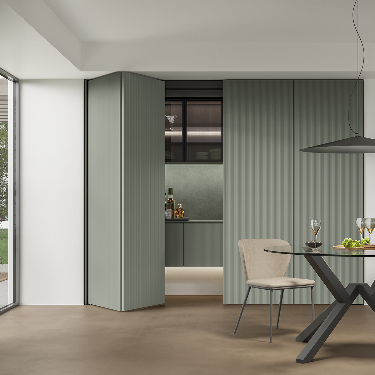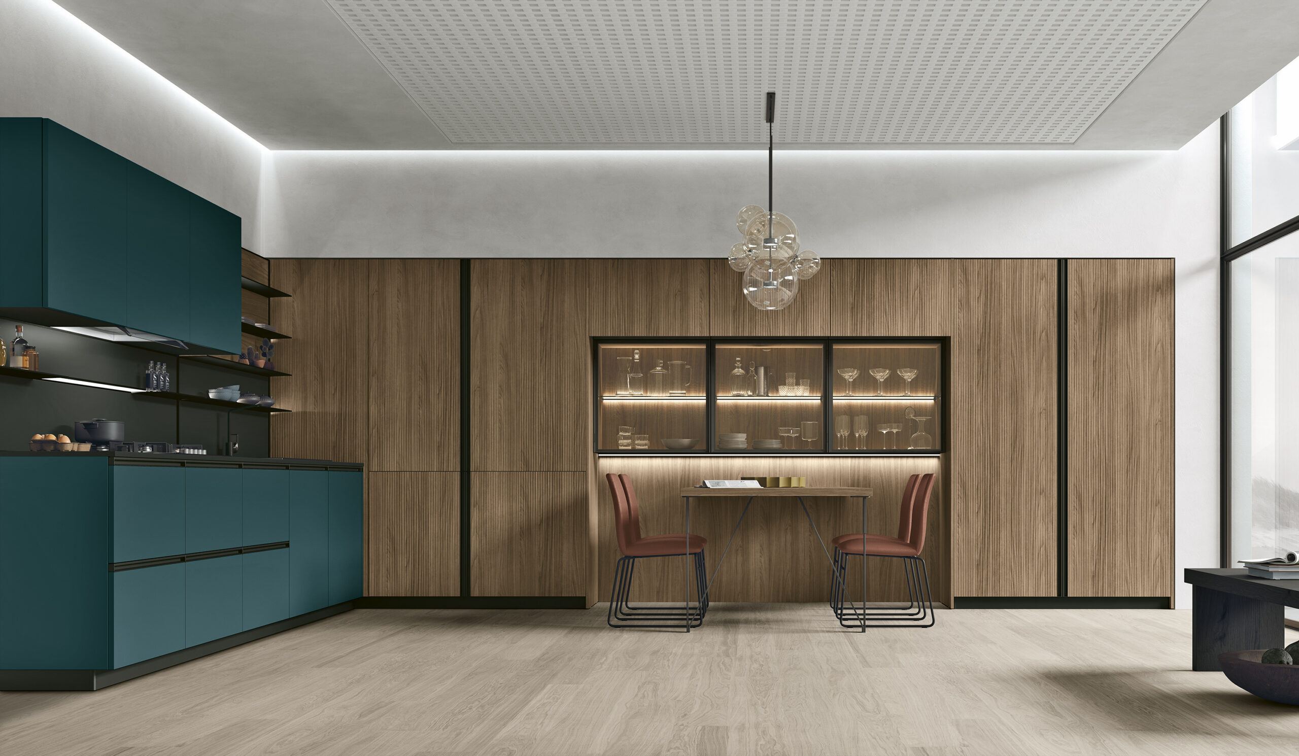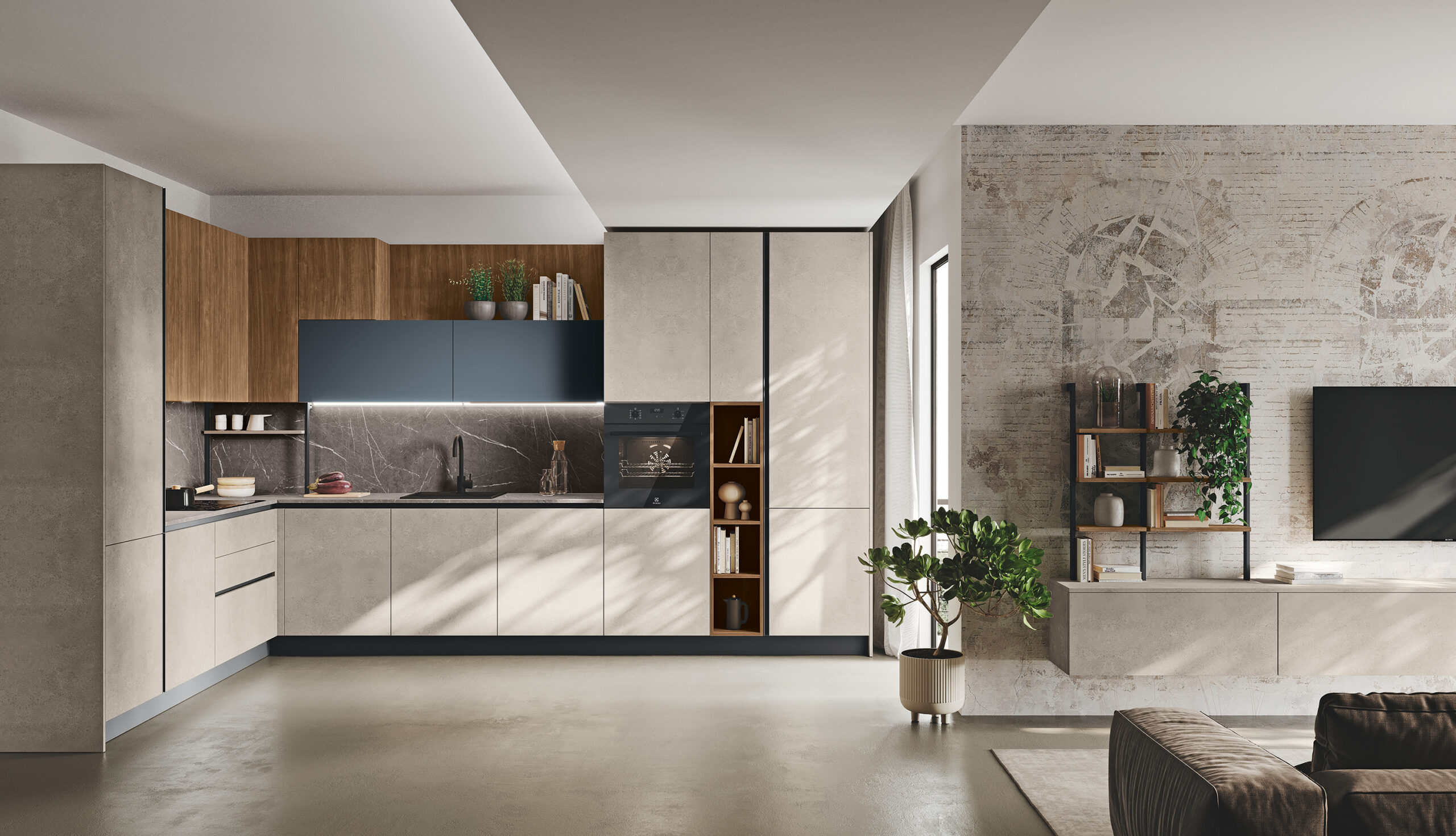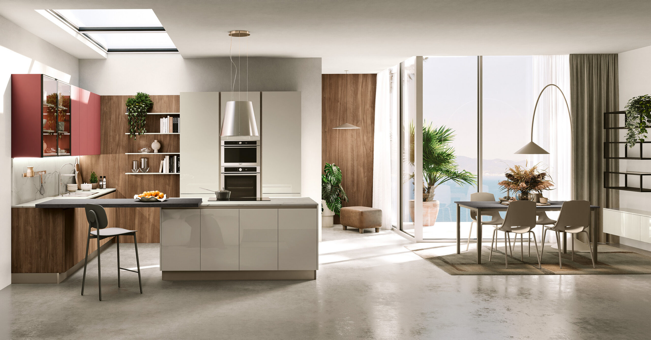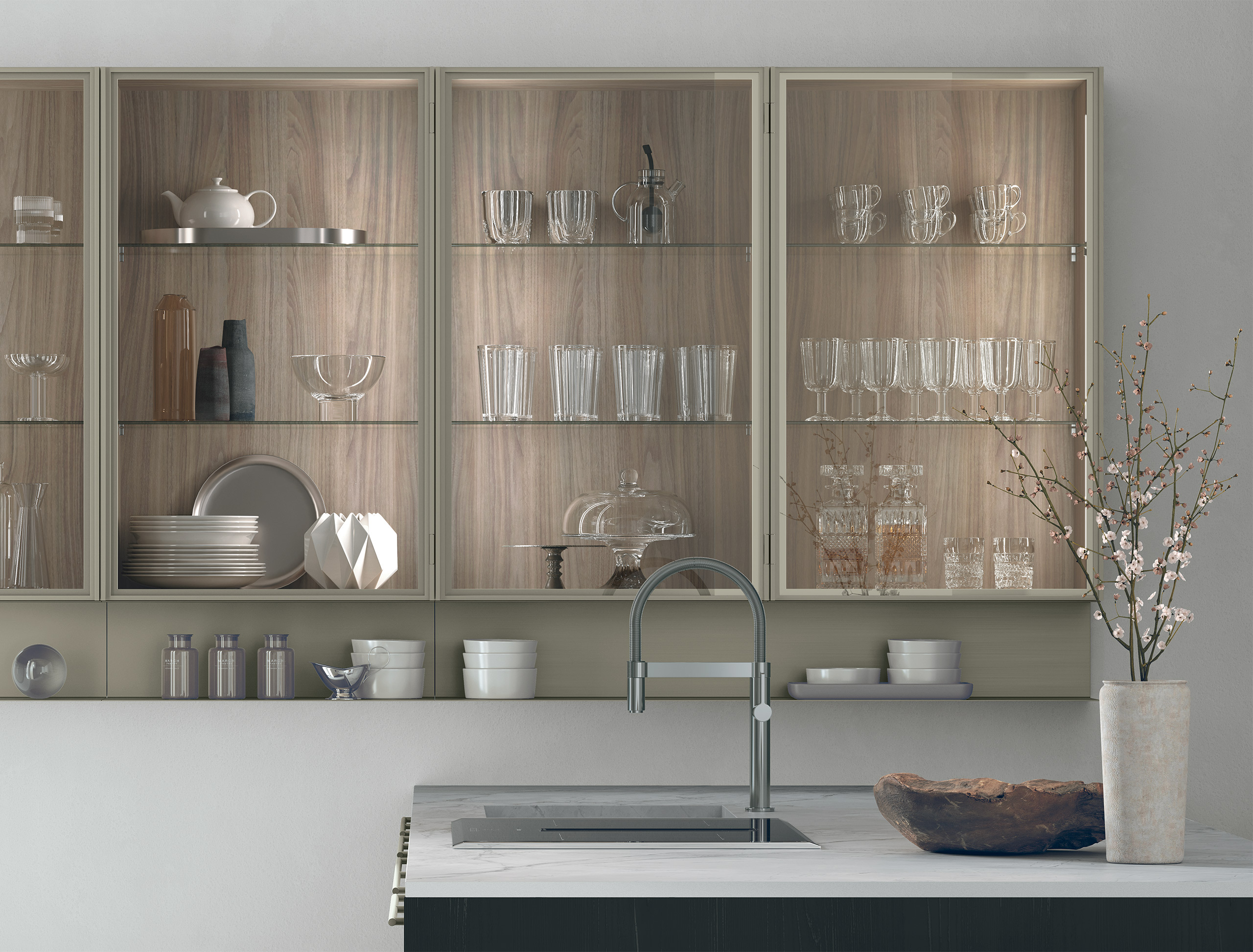 Släta luckor skapar en känsla av skandinavisk enkelhet och lätthet. Den rena designen framhäver kökets moderna och avskalade karaktär och skapar en funktionell och stilren atmosfär.